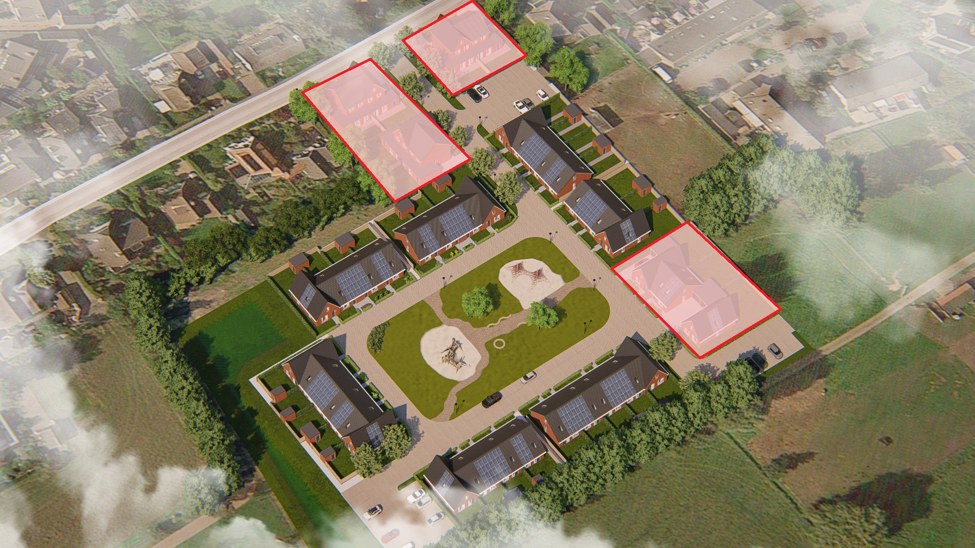 - 8 eengezinswoningen met 3 slaapkamers (badkamer en slaapkamers op de verdieping)
